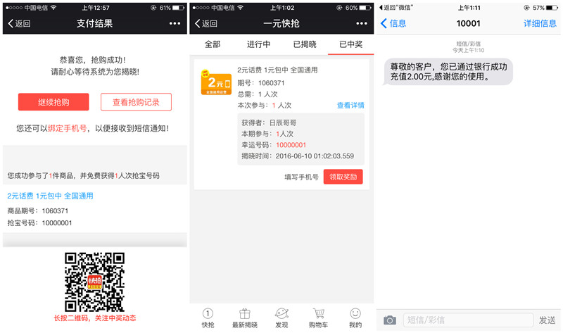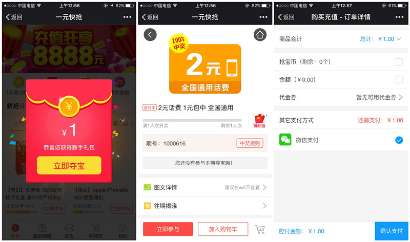 一元快抢1元购2元话费 100%中奖