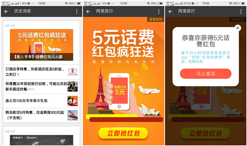 2,查看历史消息“6月14日那条”进入,领取5元话费红包(没参与过任何 阿里旅行活动的号必中)