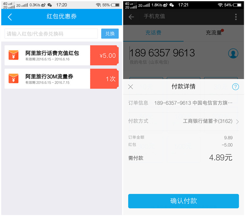 阿里旅行新用户领5元话费优惠券 充10-5可抵用