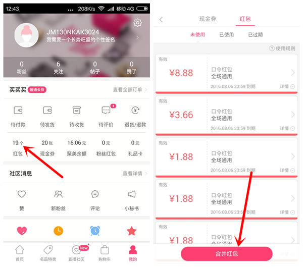 2、领完这18个红包后,差不多有20元左右,到【我的 - 红包】里,合并全部红包