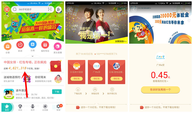 360手机助手的活动,这次“中国女排”红包专场,每期可领两个现金红包,可提现!