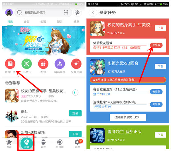 1、打开360手机助手app。点【游戏】-【悬赏任务】