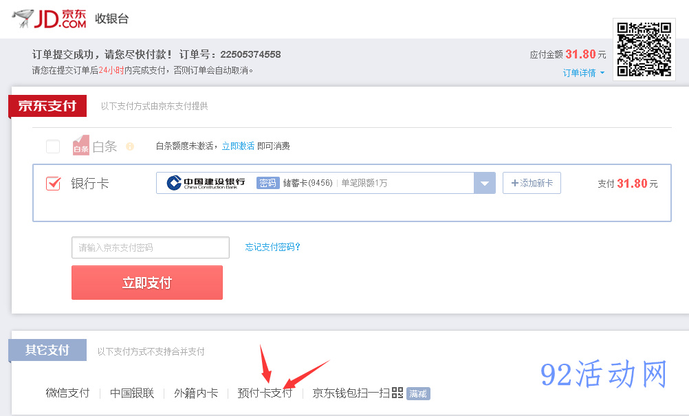 3、去;东商城找到合适商品下单(小编买的是16G的U盘,31元),点击付款,到达付款界面,如图,提交订单选下面的其它支付里的预付卡支付。