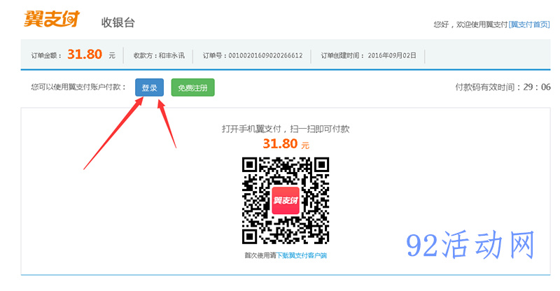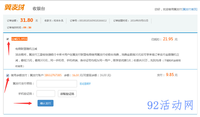 2、最好是电脑和手机一次操作,手机用来注册新翼支b帐号及充值,如下图翼支付帐号里充值16元就够了!