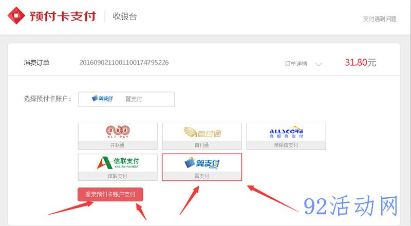 4、选择翼支付,然后点击下面的【登录预付卡账户支付】