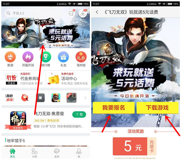 1、下载 360游戏大厅,然后打开 点 幻灯片“来玩 就送5元话费”进入活动页面