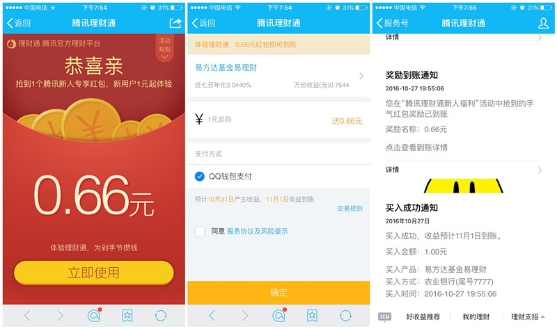 QQ理财通最近也是蛮拼的,今天又送红包了,老用户0.66、新用户4,都只需支付1元,活期秒提现的!