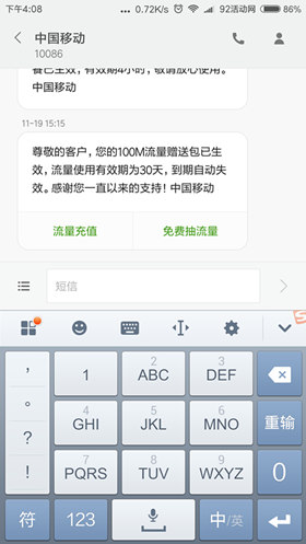 中国移动的活动,入会赢流量,100%抽100M-2G流量,24小时内到账