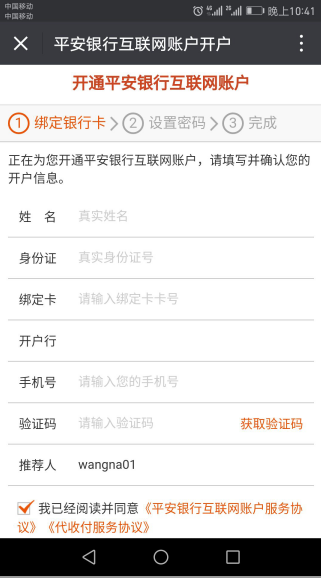 2.进入注册页面,完善相关信息,绑定任意银行(不用平安银行卡)后,完成注册。