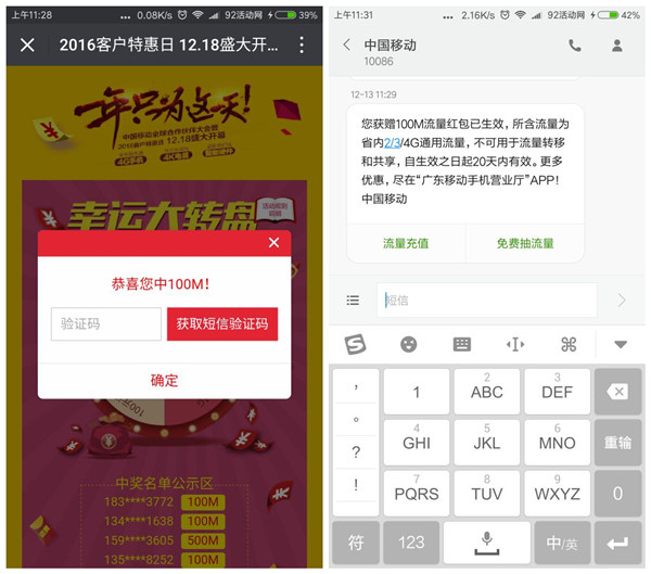 中国移动2016客户特惠日,抽奖得100M、500M、1G流量