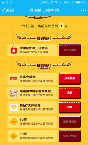 登空间领福利新一期,可以领京东免邮券、7天黄钻