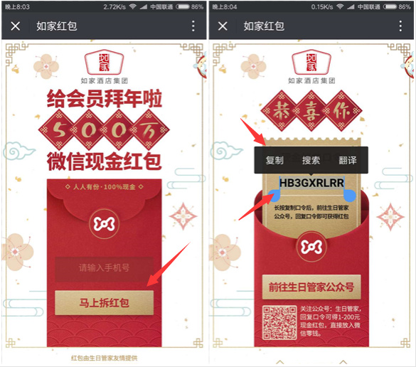 如家红包 100%秒领1~3元微信红包(秒到)