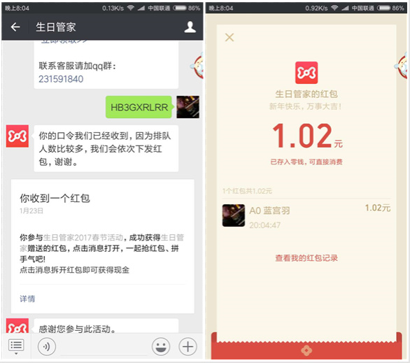 3、发送口令,秒到1元微信红包