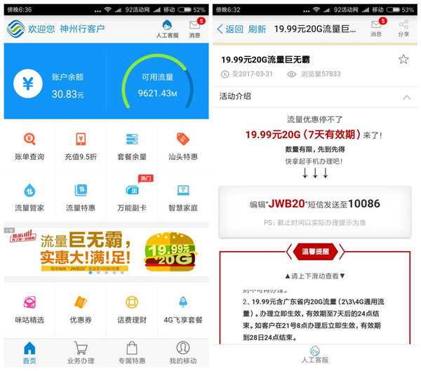 3月最新的“广东移动20G流量活动”,有效期只有7天