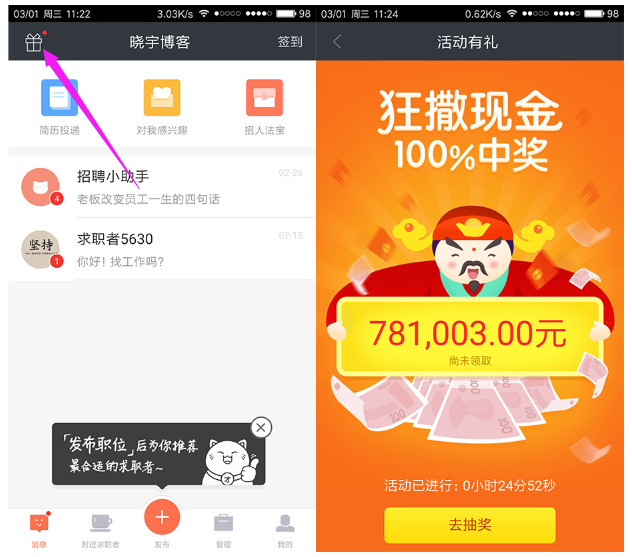 招才猫又来活动了,基本100%得2元微信红包,2天内发放,还算可靠。100万送完即止