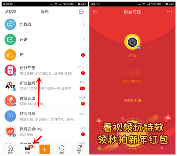 又一个新浪微博的红包活动,这次是秒拍的,安卓不用下载 可以直接领红包(应该是bug),苹果需要下载