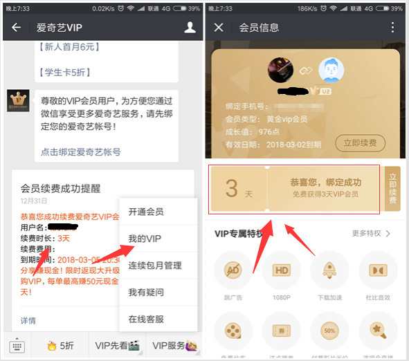 爱奇艺关联微信 100%领3天爱奇艺会员(秒到)