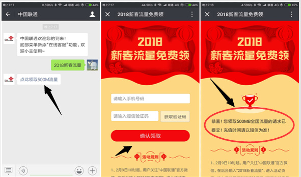 2:发送【2018新春流量】,进入领取即可