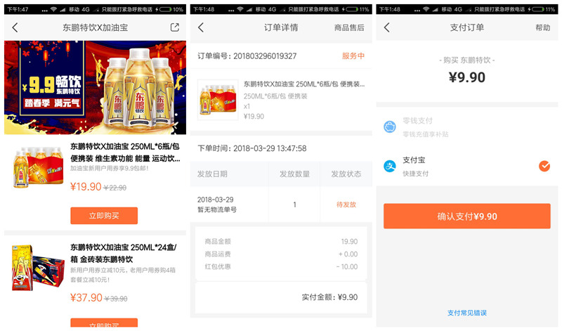 加油宝新用户9.9元买6瓶东鹏特饮,用支付宝支付即可!