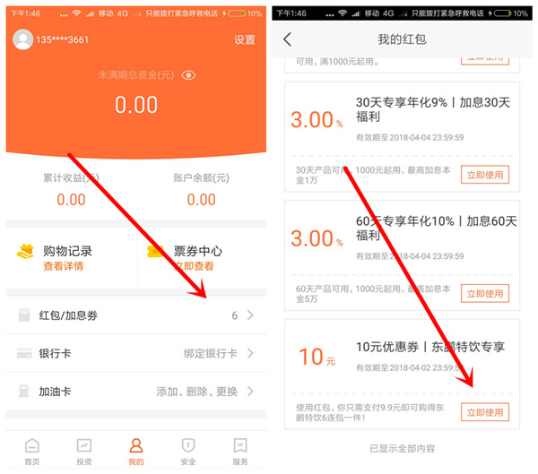 2:打开app,点【我的】-【红包】-【立即使用】