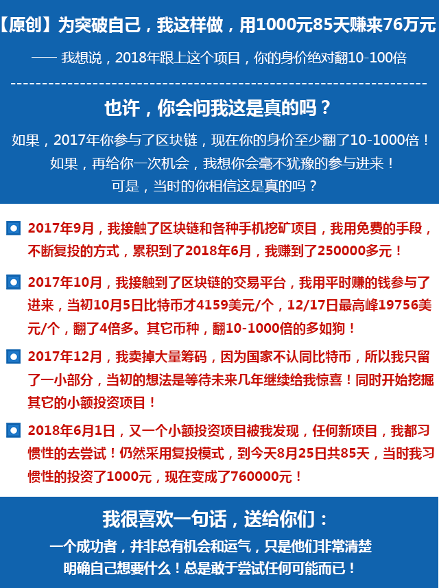 也许,你会问我这是真的吗?如果,2017年你参与了区块链,现在你的身价至少翻了10-1000倍!如果,再给你一次机会,我想你会毫不犹豫的参与进来!可是,当时的你相信这是真的吗?