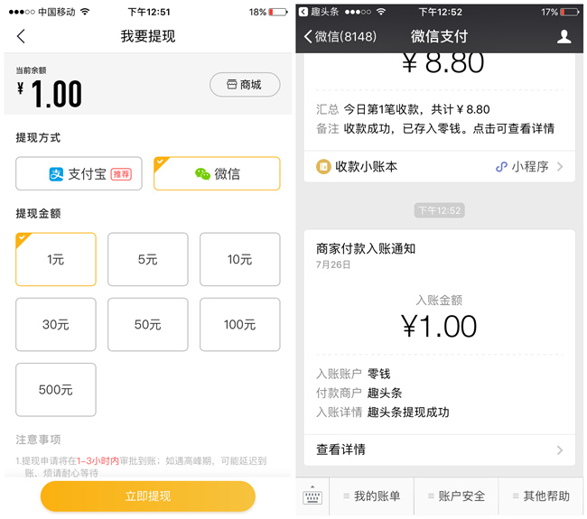 趣头条的活动,1元微信零钱是秒到账的!5Q币等了好几天才到账