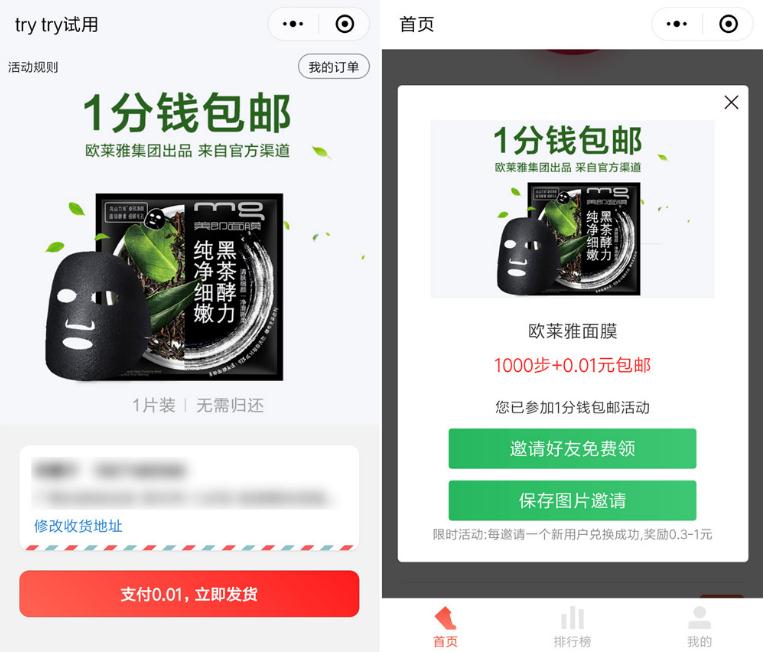 trytry试用 新人0.01元撸韩束面膜(包邮)