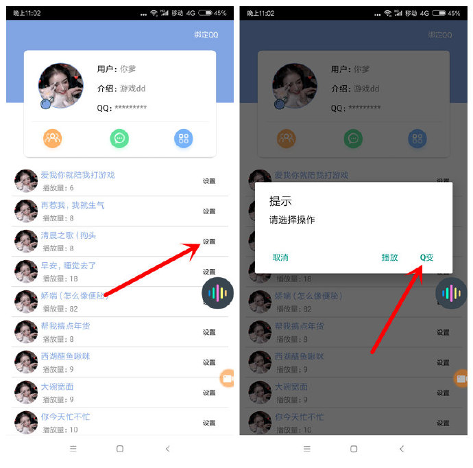 3:返回软件,选择你/发送的语音包,点击【Q变】
