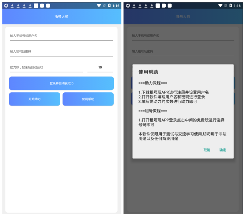 2:打开我们的撸号大师app,输入租号玩账号密码,然后助力20次
