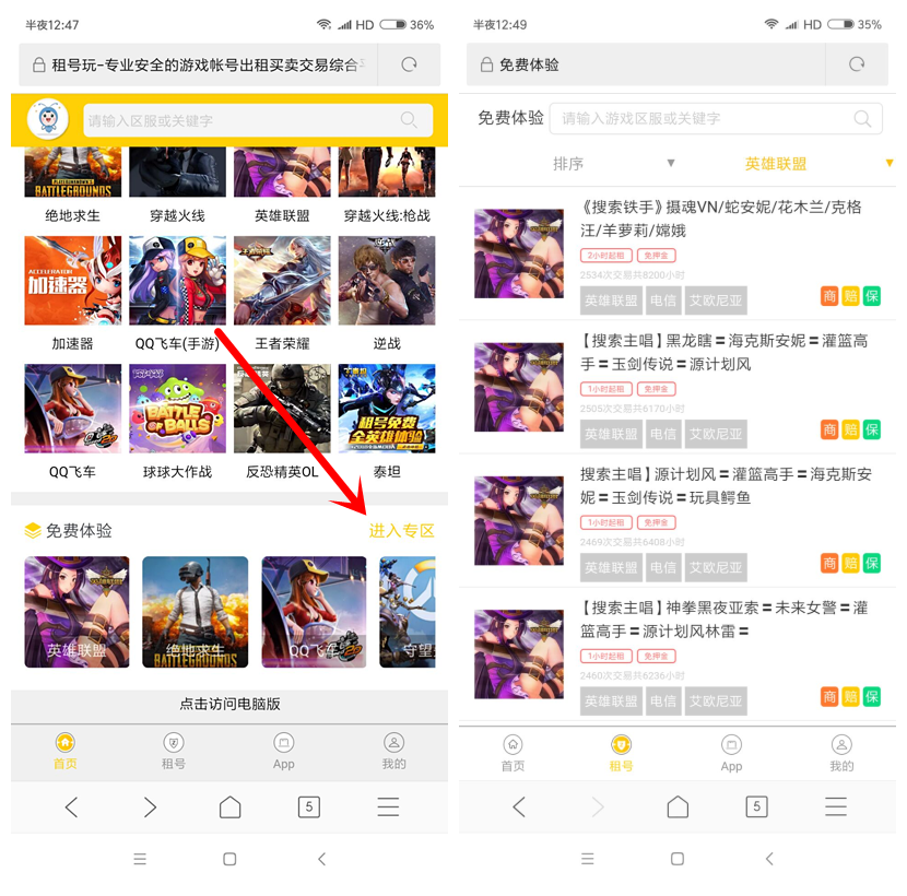 2:我这里以英雄联盟为例,选择【免费体验】,然后使用体验券即可,一张券一小时