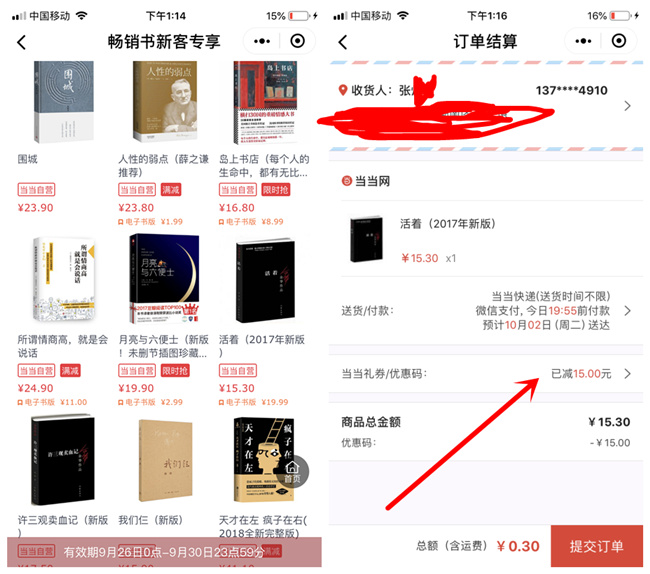 2:买15.3元的《活着》,输入券码:I45X8Z 支付0.3元