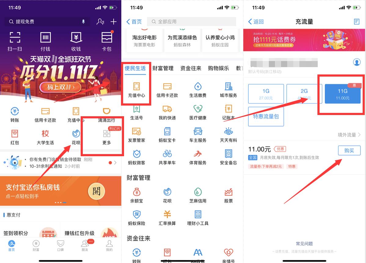 打开支付宝app,点【充值中心】-【充流量】进入,选择11G的就是了