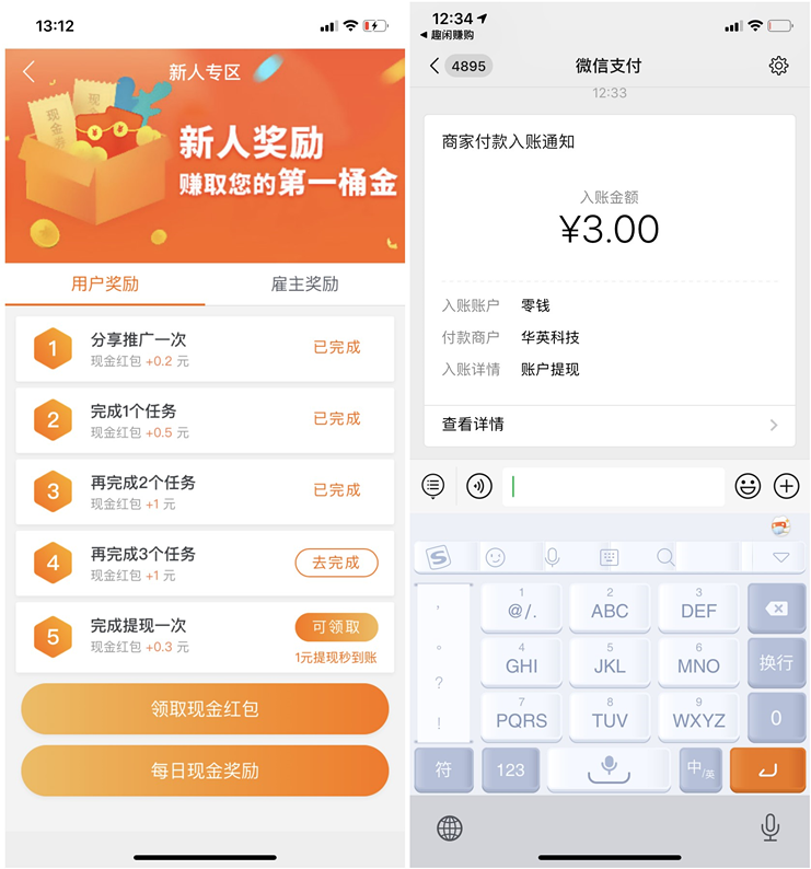 2:打开趣闲赚APP,首页【新人奖励】进去可以看到,几个新人奖励