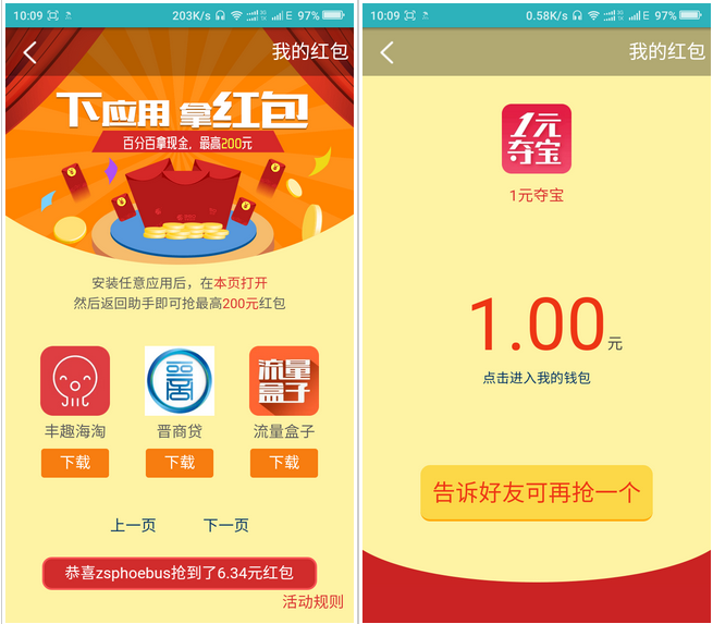 2、随便下载安装一个软件,安装后返回活动页面开红包。告诉好友还能再抢一个 也就是100%得两个现金红包