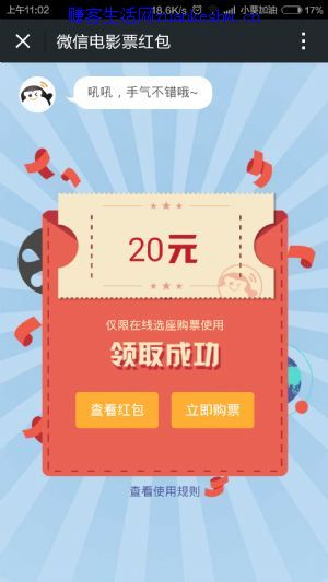 扫码100%领取20元微信电影票红包