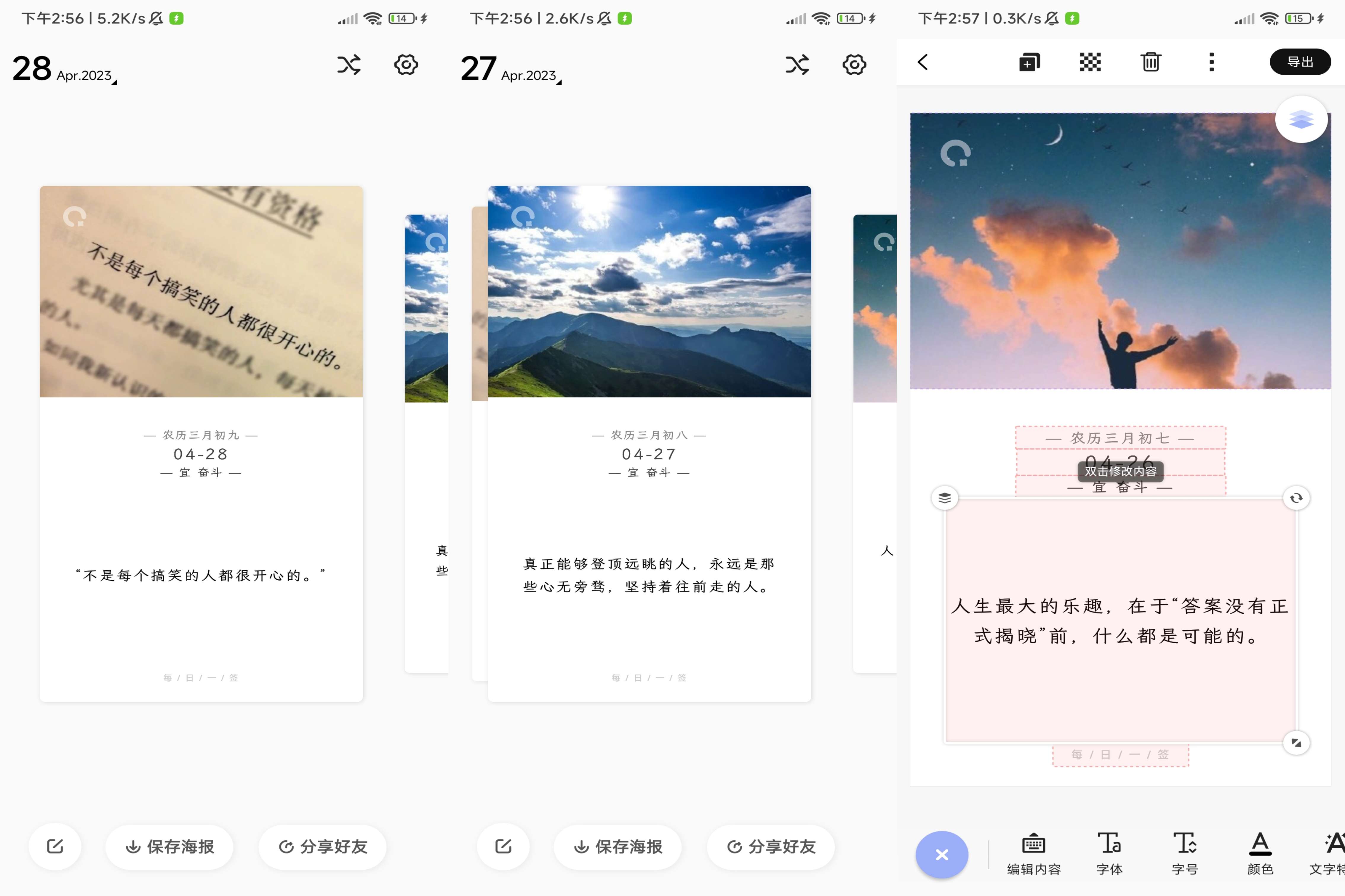 一款简单易用的早安海报图片编辑软件,零设计基础的用户,简单拖拉拽,简单易用,百变多样。轻松引爆你的朋友圈!创作出属于自己的原创早安心情海报。(去广告功能)