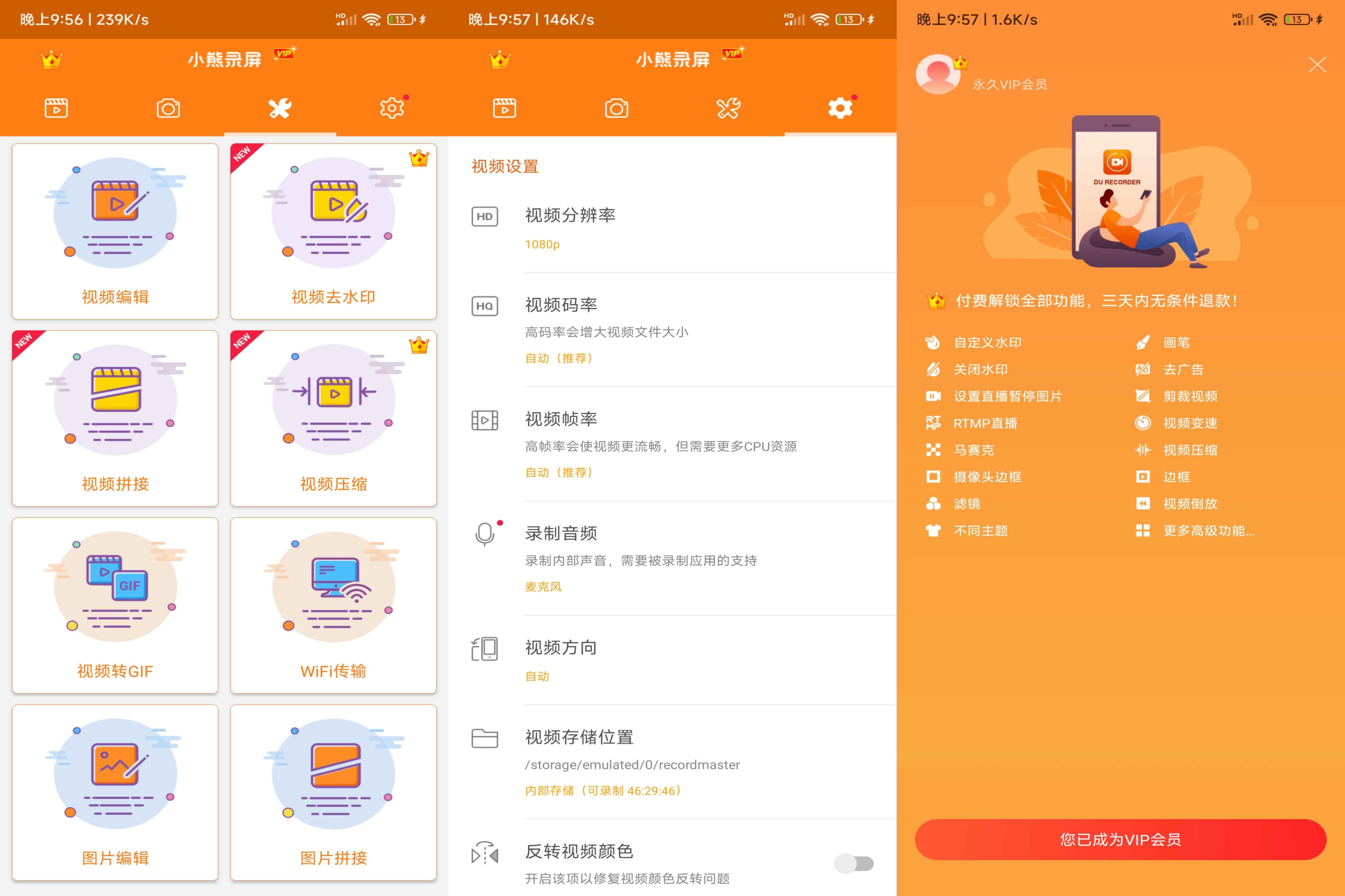 一款功能非常专业且强大的手机录屏软件,这款软件的使用方法十分的简单,只需轻松一点就能轻松录制屏幕画面,而且录制过程特别的流畅,不会有任何的卡顿。(解锁VIP功能)