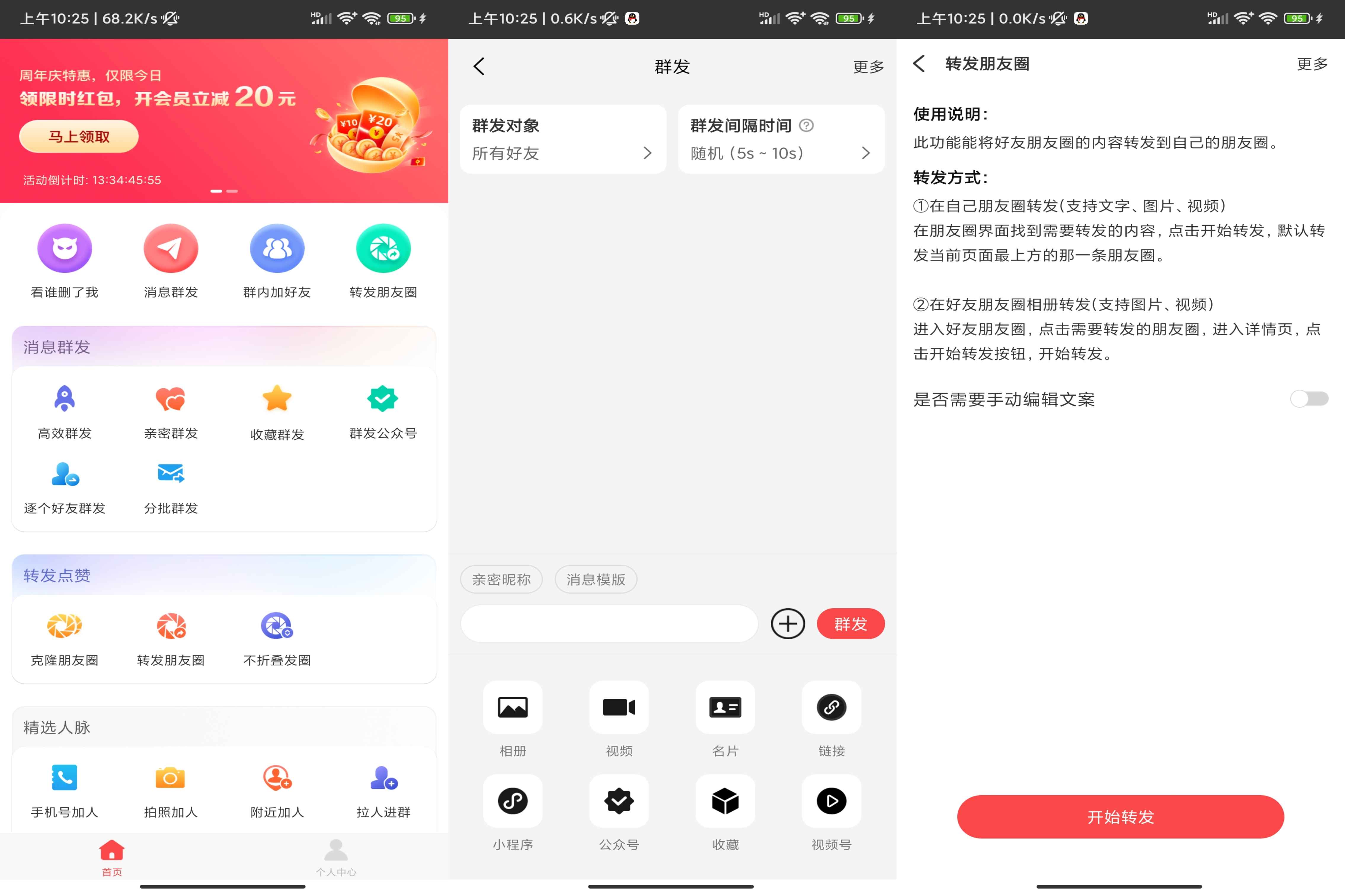一个微商必备的软件,提供海量微商必备的工具,检测僵尸粉、一键群发、群内加人、自动拉人进群、九宫格切图、图片加水印....找人脉、好推广、赚钱快。快来下载试试吧。(解锁VIP功能)