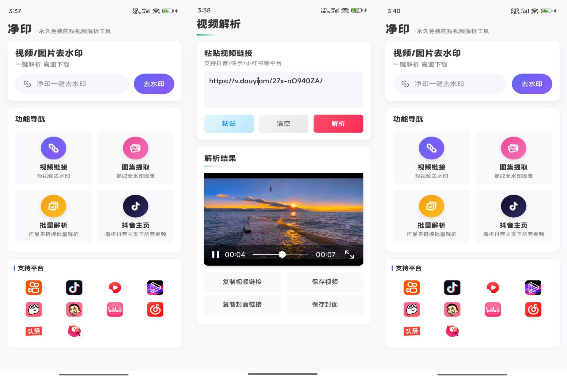 一款手机短视频处理App,去水印解析,轻松编辑!提供短视频去水印、视频解析、图集解析等多种功能,让你轻松处理短视频,创作个性化内容。界面简洁,操作便捷,是你的短视频创作好帮手!