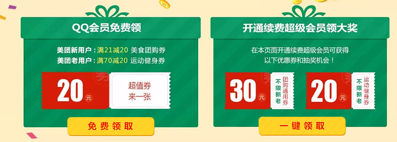 1、QQ会员可以直接领取新用户满21减20的美食团购卷!老用户领取满70减20的运动健身卷!