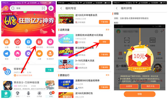 1、打开360手机助手app,首页【福利专区】进入找到京东钱包并下载