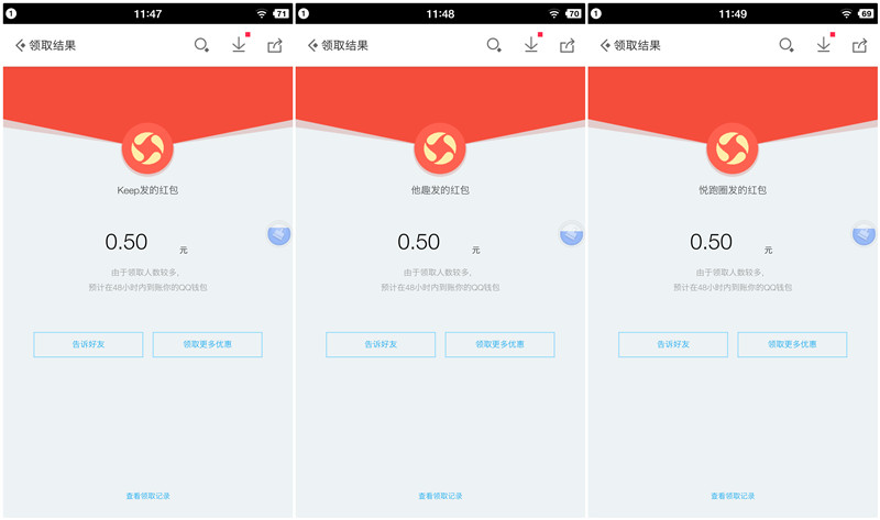 应用宝下载应用送红包新一期,这次是【Keep】、【他趣】p【悦跑圈】,小葵测试3个红包都是0.5元哦!
