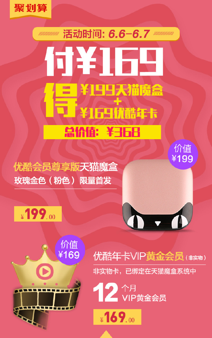 天猫官方活动,169元购买一个天猫魔盒送一年优酷vip会员,或者你也可以理解为购买一年优酷会员送天猫魔盒,都是一个概念,有需要的上